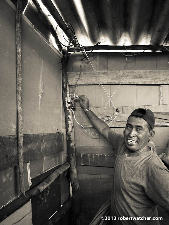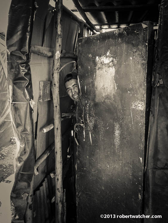 Going through the front gate that separated his home from all of the others crammed in on small lots on this section of redistributed property - - - near the front door, was the water faucet for washing hands, and the wood stand for washing his clothes. Another feature was the 9 foot hole that he is digging in the back corner of the property, so that he has bathroom facilities.