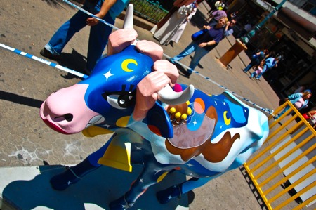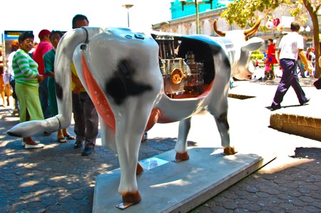 While walking down Avenida Central in San Jose on Friday we saw these beautifully and artfully decorated cows. Flashbacks of Mel Lastman's Toronto moose went through our minds. We couldn't resist taking their pictures. The concept was much the same, each one sponsored by a local business and painted by a local artist. Here are 7 of the more colourful ones we saw.