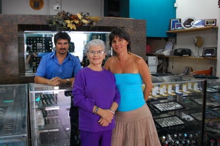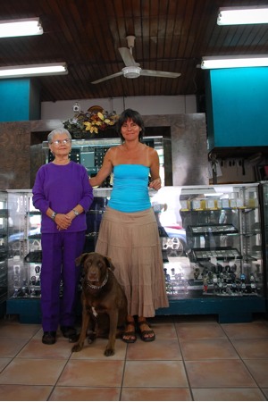 Rob came home from Alajuela a while ago with a gift for me - a gorgeous tri-coloured gold earrings, a cute butterfly with rhinestone accents. So cute and so loved by me. We returned just a few days ago to look around and took the owner's and staff's picture as well as the family pooch!!